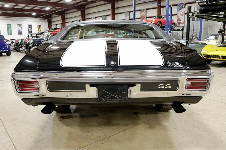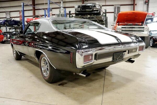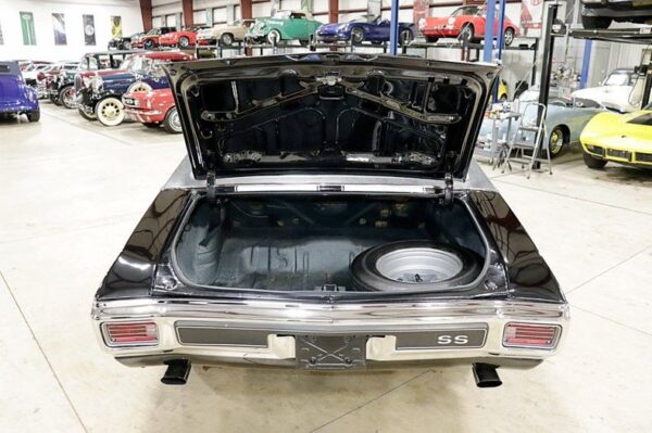 Up front, the Chevelle SS features a wide, split grille with dual headlights on each side, framed by clean chrome accents and the signature “SS” emblem that proudly announces its performance pedigree. The long, sweeping hood and sculpted side panels emphasize its athletic proportions, while the dual racing stripes—often stretching from the hood to the decklid—add an unmistakable touch of sportiness. The rear end is equally striking, with rectangular taillights and chrome bumpers that complete the classic muscle car look.